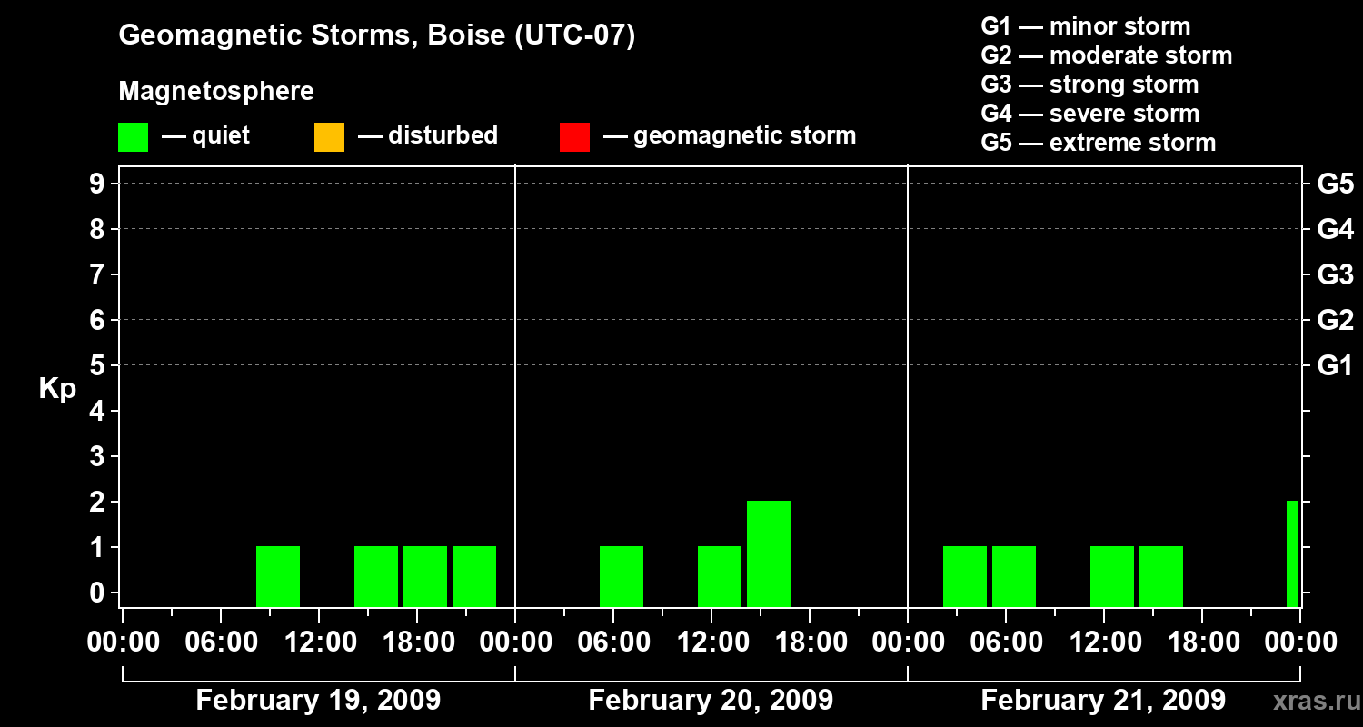 Changes in the geomagnetic index Kp from February 19 to 21, 2009 for mid latitudes