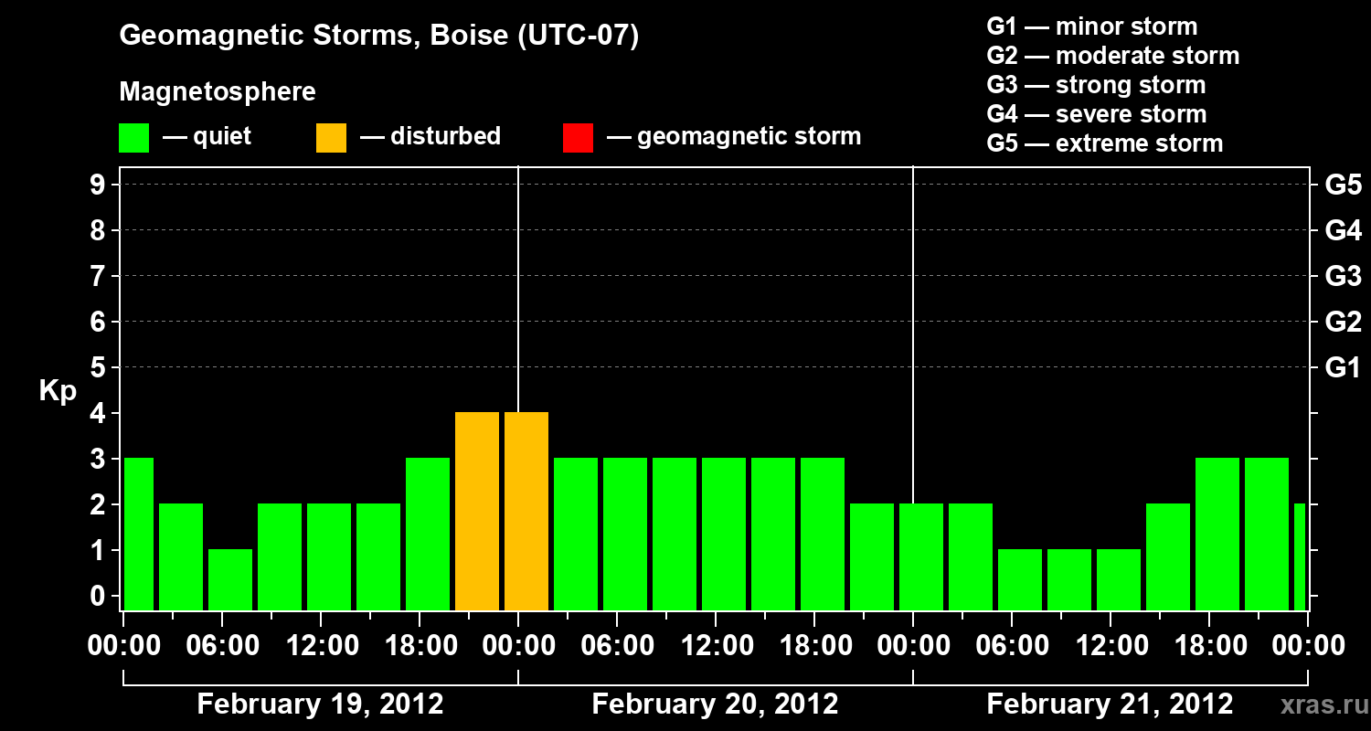 Changes in the geomagnetic index Kp from February 19 to 21, 2012 for mid latitudes