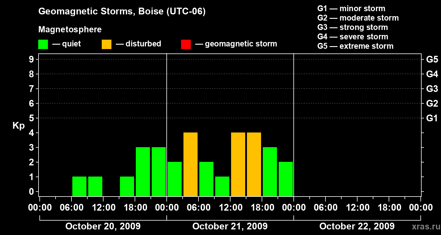 Changes in the geomagnetic index Kp from October 20 to 22, 2009 for mid latitudes