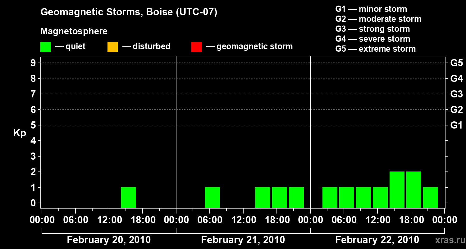 Changes in the geomagnetic index Kp from February 20 to 22, 2010 for mid latitudes