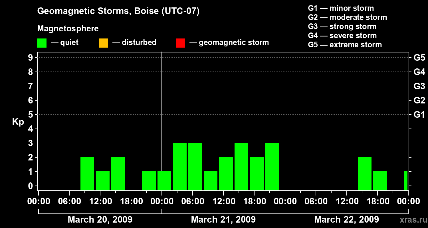 Changes in the geomagnetic index Kp from March 20 to 22, 2009 for mid latitudes