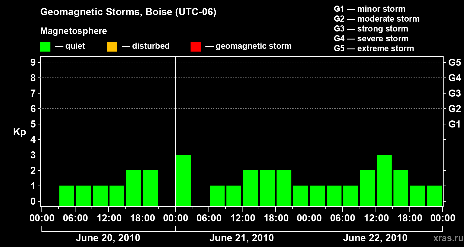 Changes in the geomagnetic index Kp from June 20 to 22, 2010 for mid latitudes
