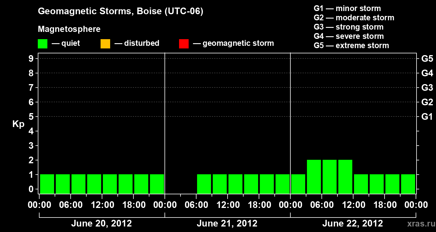 Changes in the geomagnetic index Kp from June 20 to 22, 2012 for mid latitudes