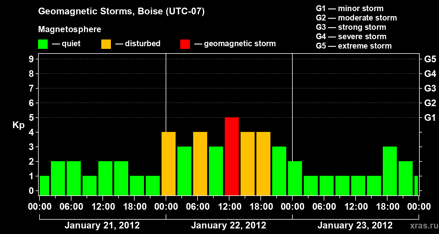 Changes in the geomagnetic index Kp from January 21 to 23, 2012 for mid latitudes