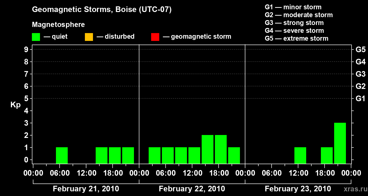 Changes in the geomagnetic index Kp from February 21 to 23, 2010 for mid latitudes