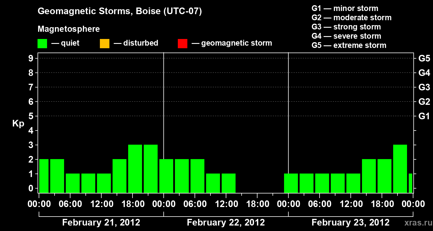 Changes in the geomagnetic index Kp from February 21 to 23, 2012 for mid latitudes