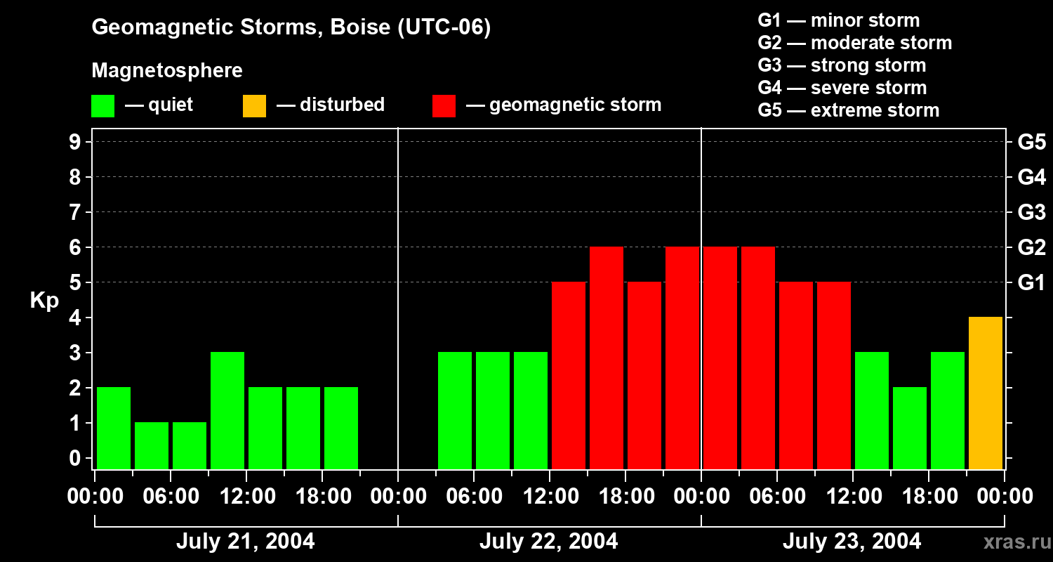 Changes in the geomagnetic index Kp from July 21 to 23, 2004 for mid latitudes