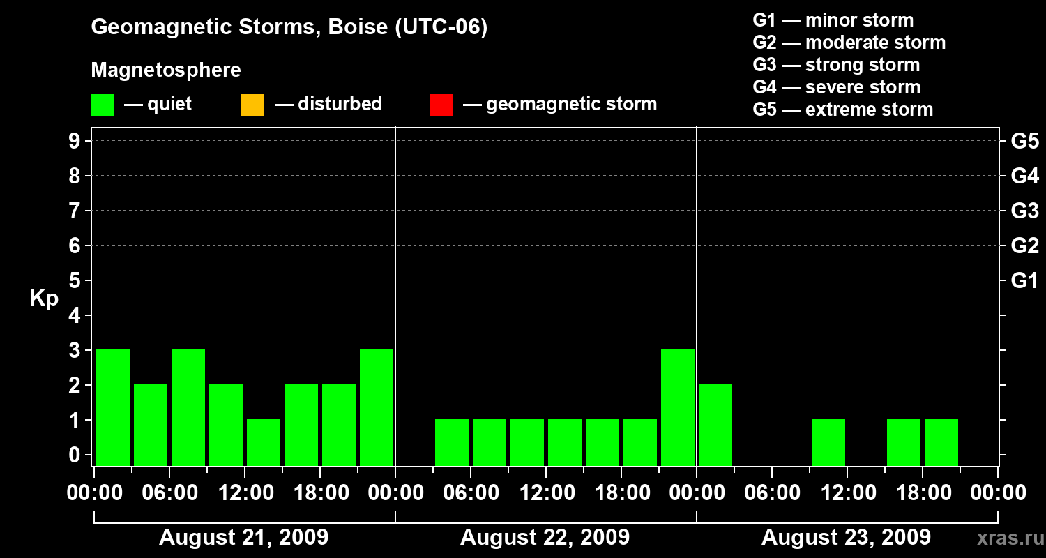 Changes in the geomagnetic index Kp from August 21 to 23, 2009 for mid latitudes