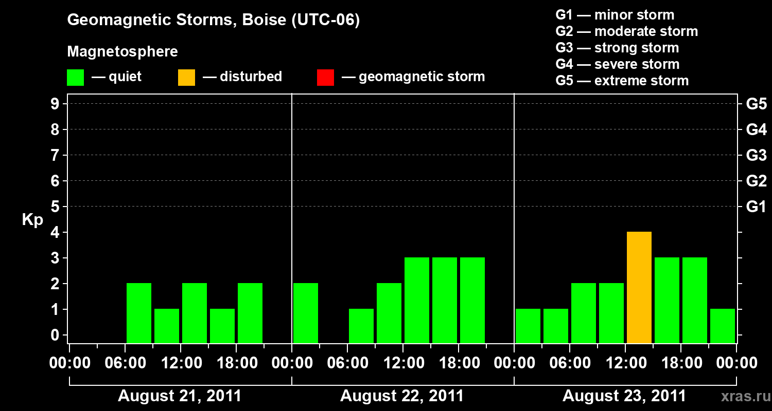 Changes in the geomagnetic index Kp from August 21 to 23, 2011 for mid latitudes