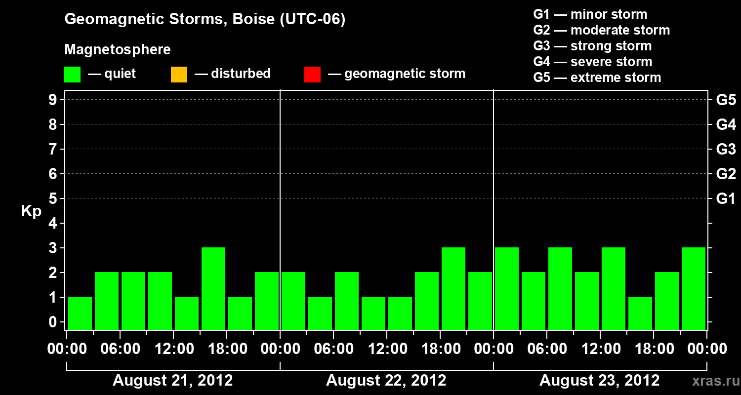 Changes in the geomagnetic index Kp from August 21 to 23, 2012 for mid latitudes