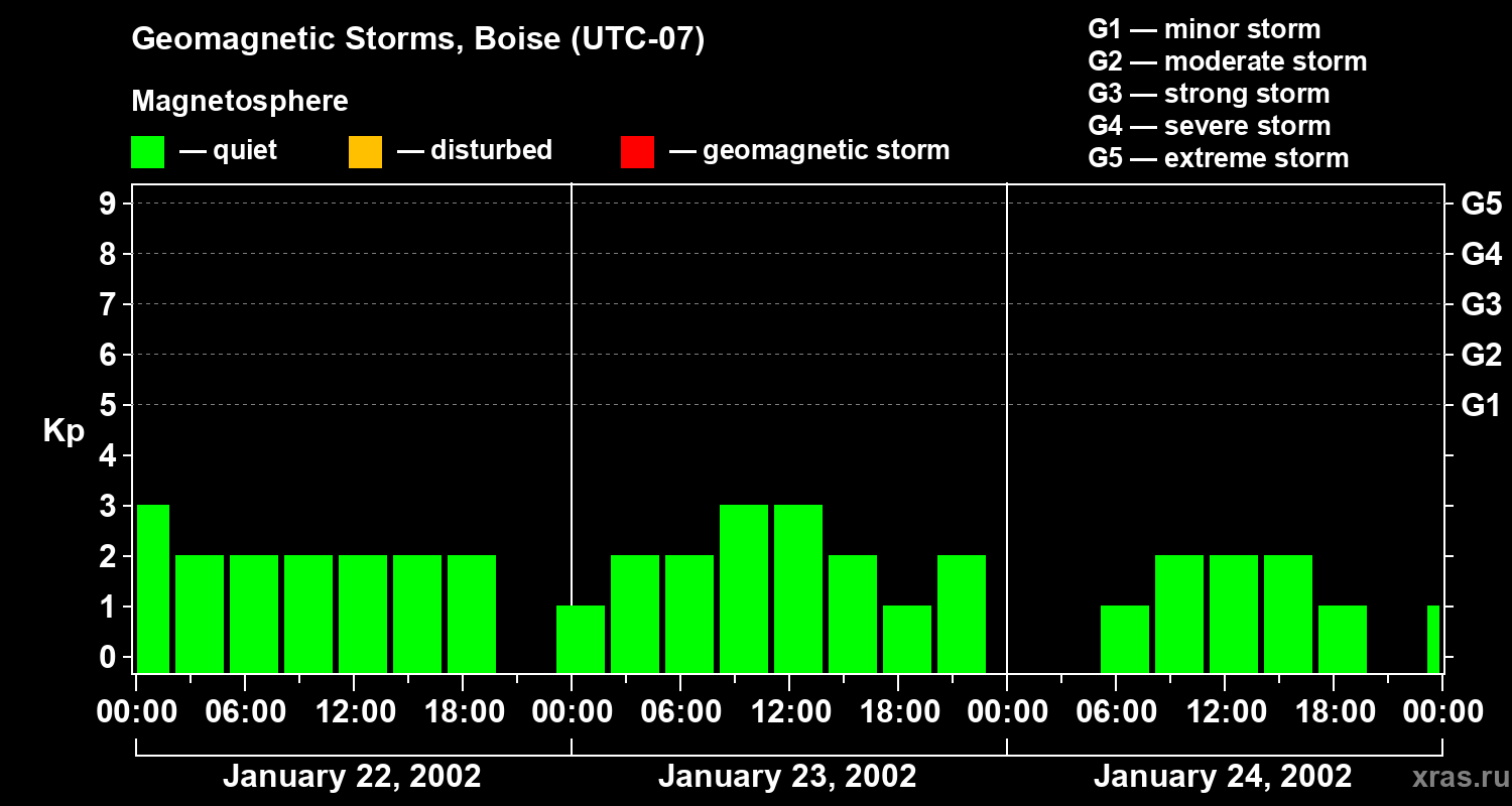 Changes in the geomagnetic index Kp from January 22 to 24, 2002 for mid latitudes
