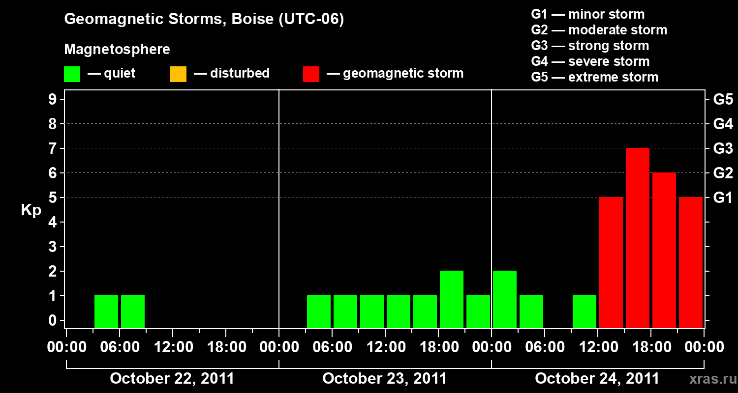 Changes in the geomagnetic index Kp from October 22 to 24, 2011 for mid latitudes