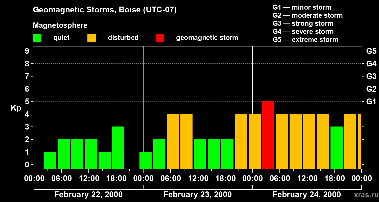 Changes in the geomagnetic index Kp from February 22 to 24, 2000 for mid latitudes