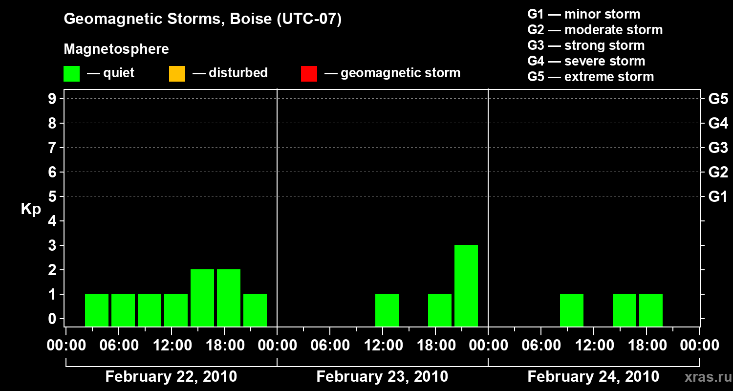 Changes in the geomagnetic index Kp from February 22 to 24, 2010 for mid latitudes