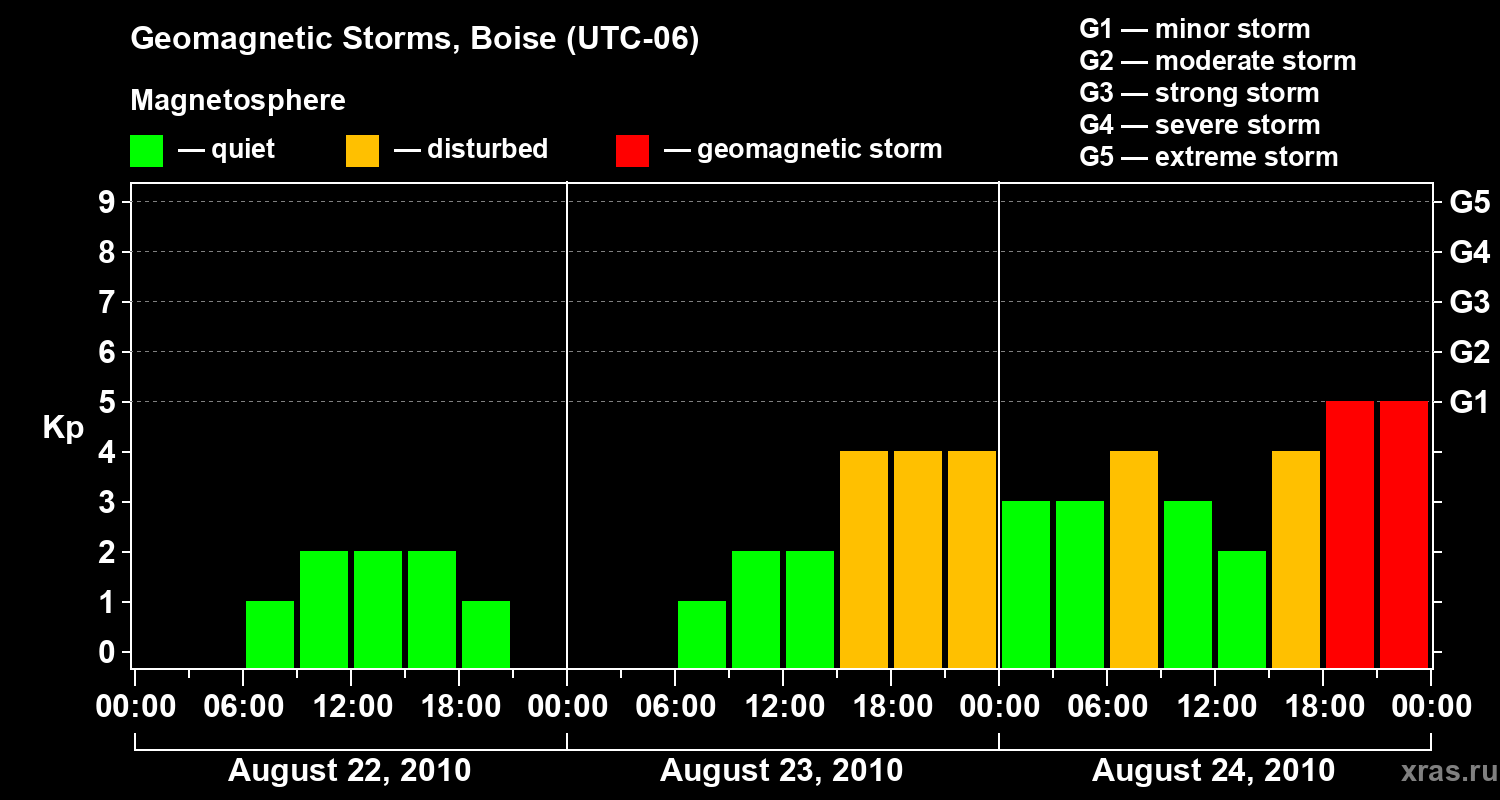 Changes in the geomagnetic index Kp from August 22 to 24, 2010 for mid latitudes