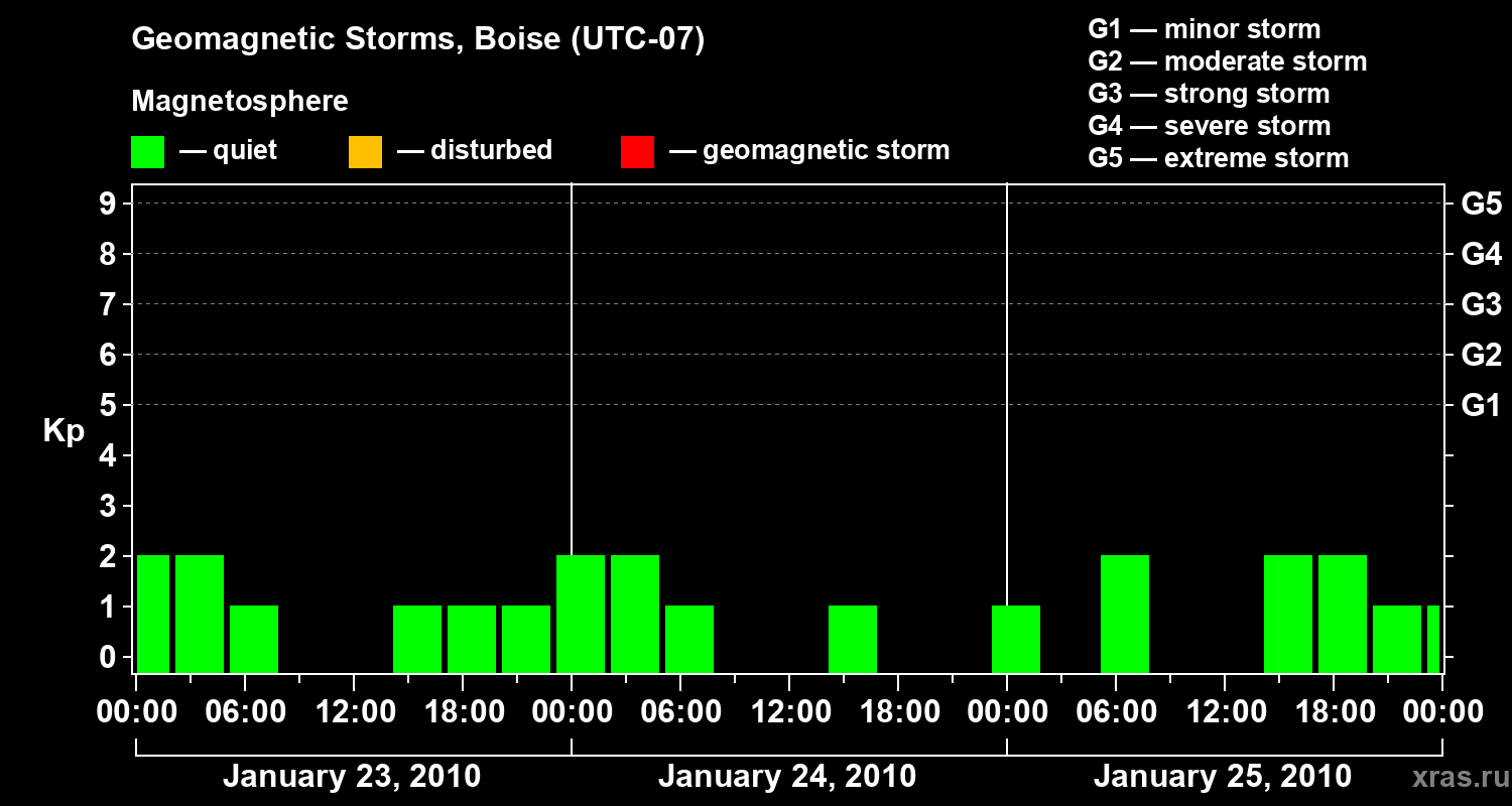 Changes in the geomagnetic index Kp from January 23 to 25, 2010 for mid latitudes