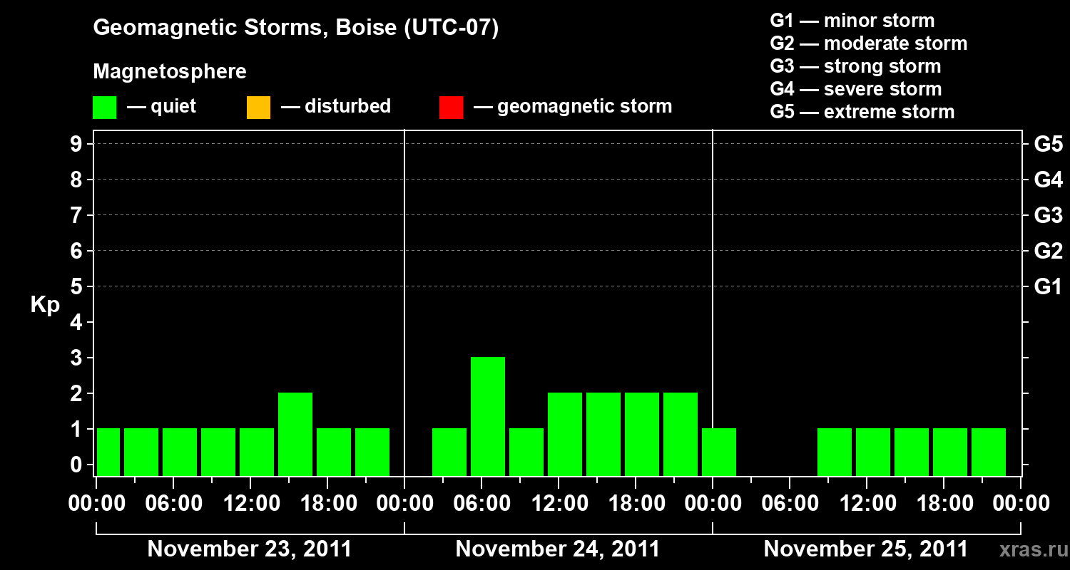 Changes in the geomagnetic index Kp from November 23 to 25, 2011 for mid latitudes