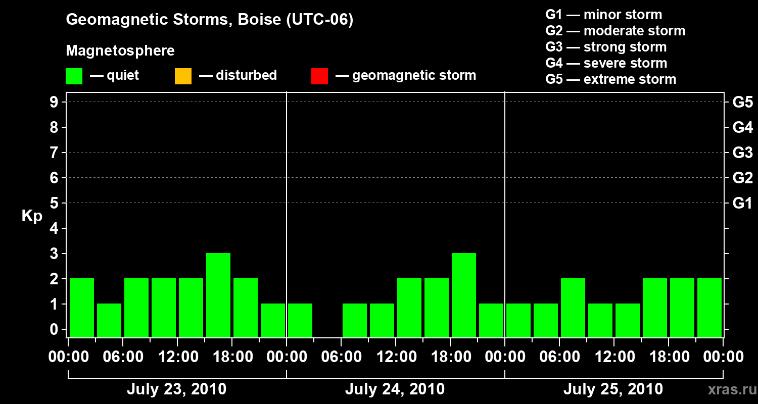 Changes in the geomagnetic index Kp from July 23 to 25, 2010 for mid latitudes