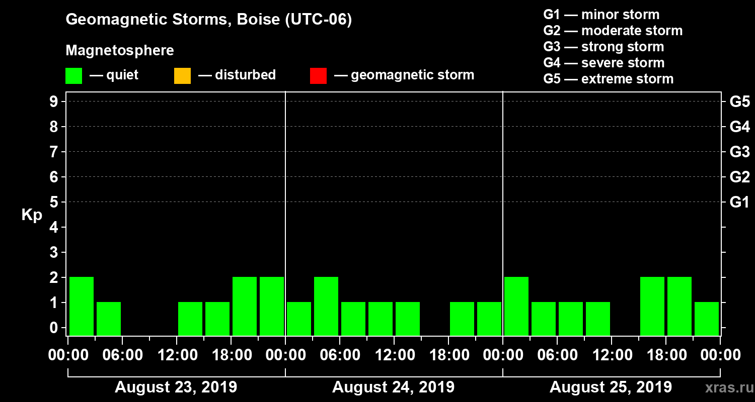 Changes in the geomagnetic index Kp from August 23 to 25, 2019 for mid latitudes
