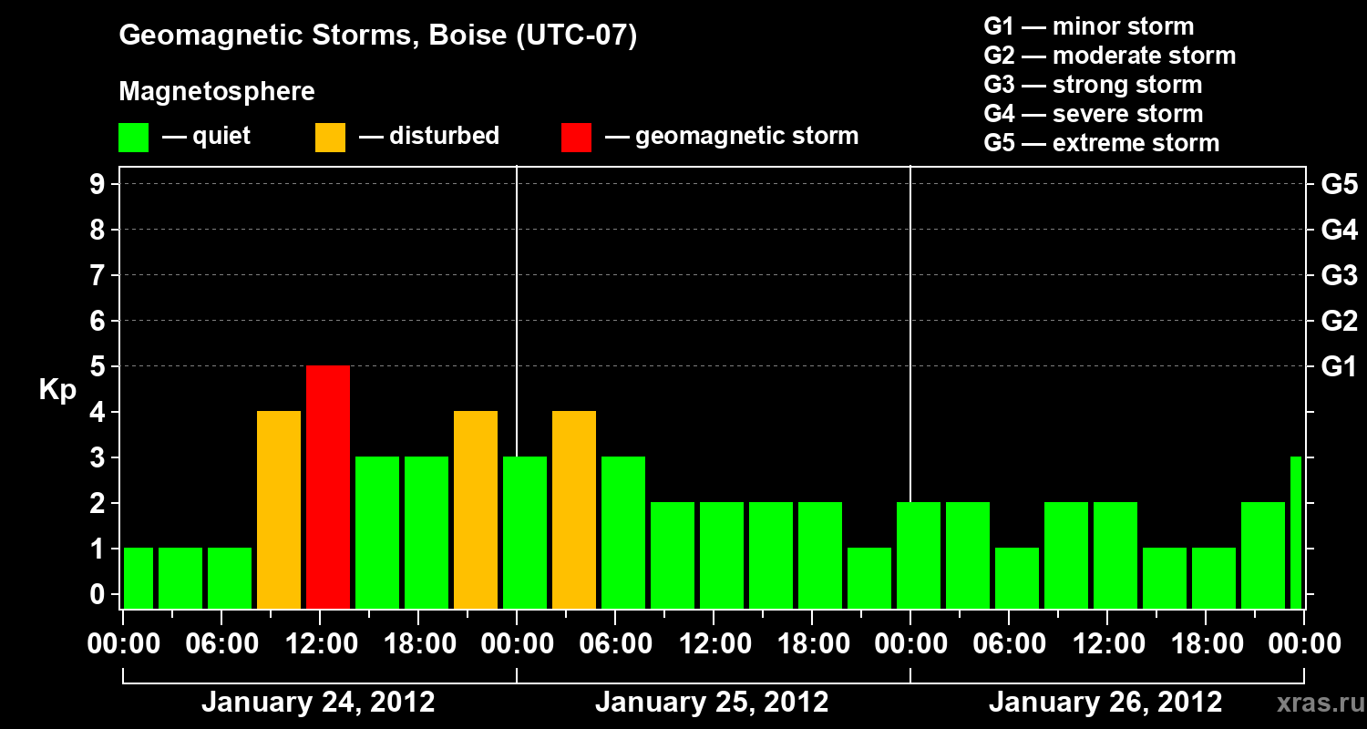 Changes in the geomagnetic index Kp from January 24 to 26, 2012 for mid latitudes