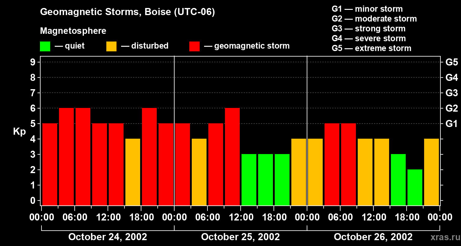 Changes in the geomagnetic index Kp from October 24 to 26, 2002 for mid latitudes