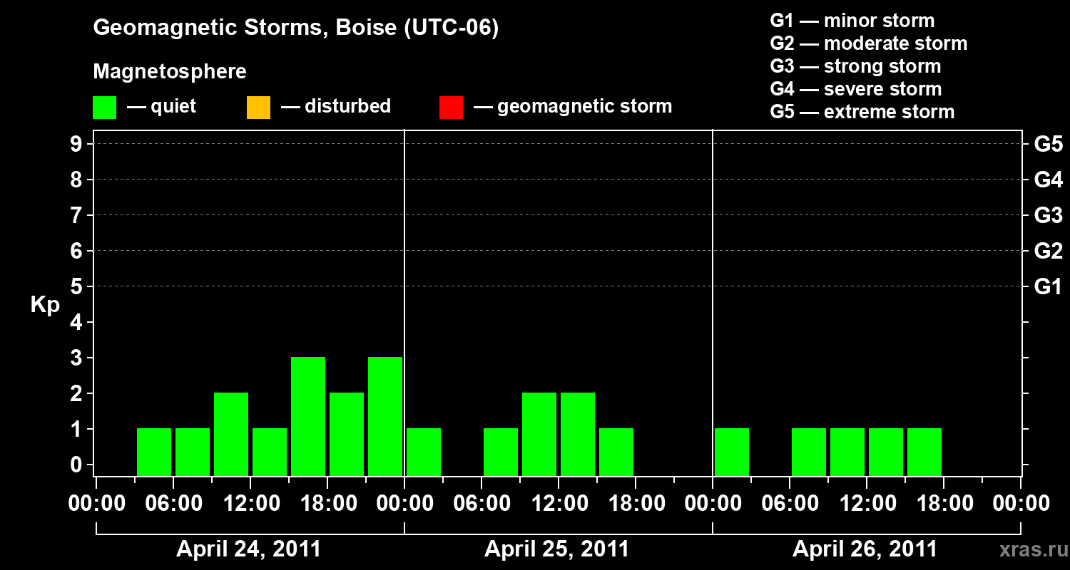 Changes in the geomagnetic index Kp from April 24 to 26, 2011 for mid latitudes