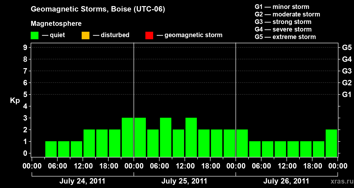 Changes in the geomagnetic index Kp from July 24 to 26, 2011 for mid latitudes