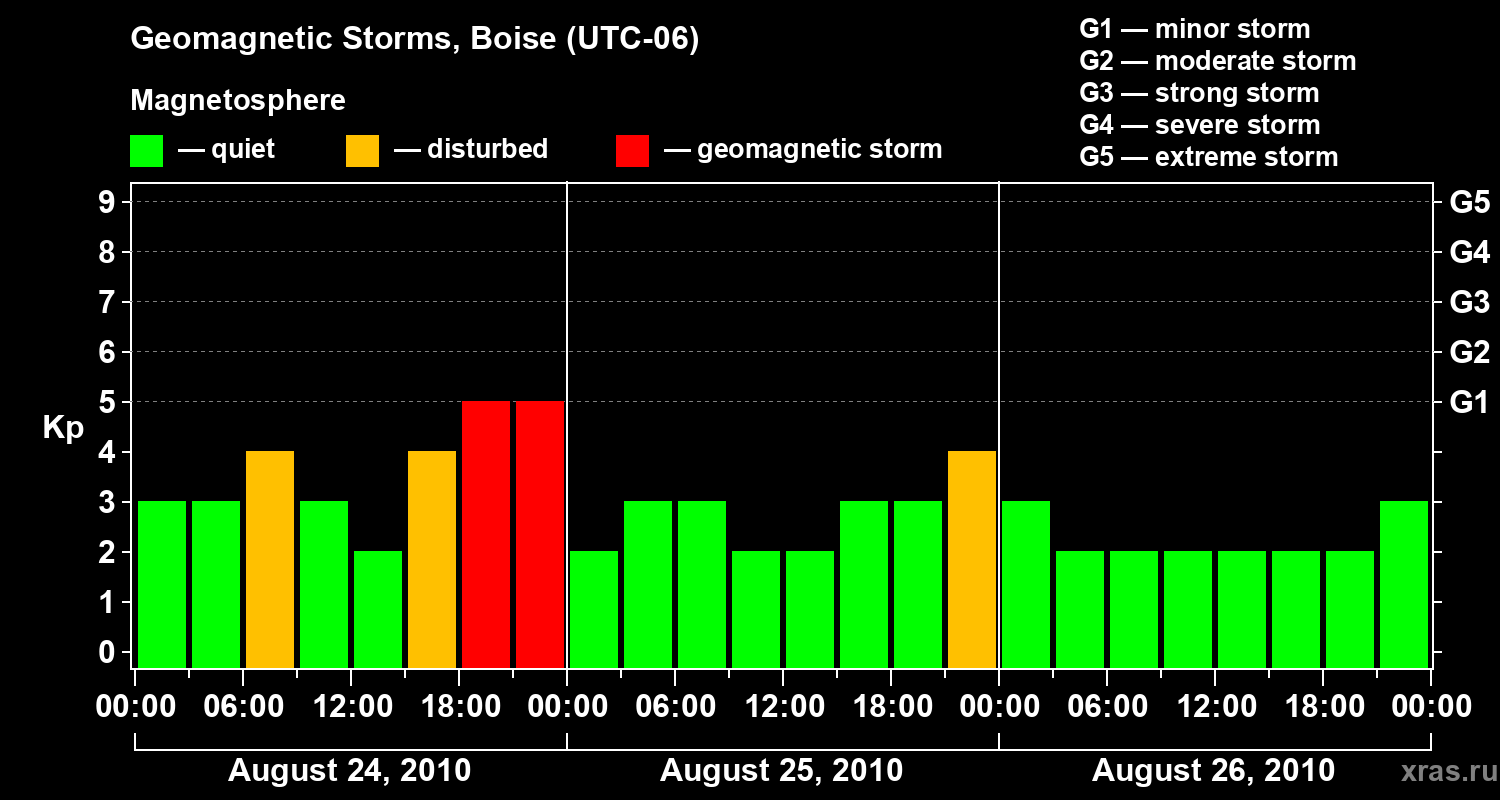 Changes in the geomagnetic index Kp from August 24 to 26, 2010 for mid latitudes