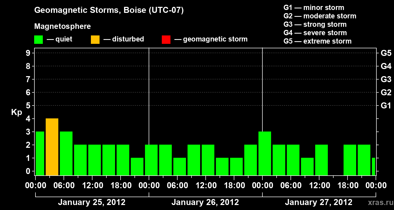 Changes in the geomagnetic index Kp from January 25 to 27, 2012 for mid latitudes