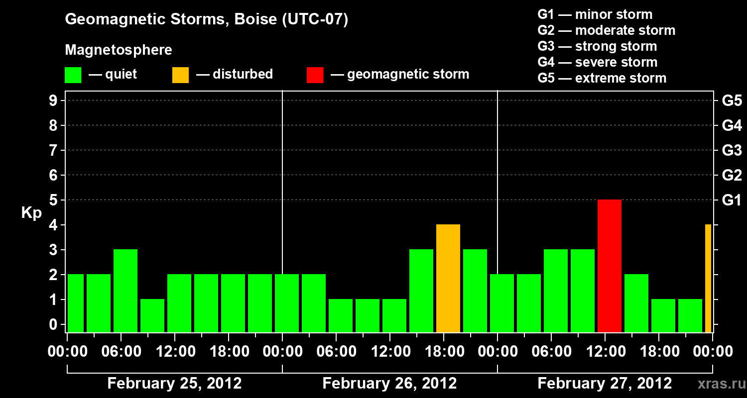 Changes in the geomagnetic index Kp from February 25 to 27, 2012 for mid latitudes