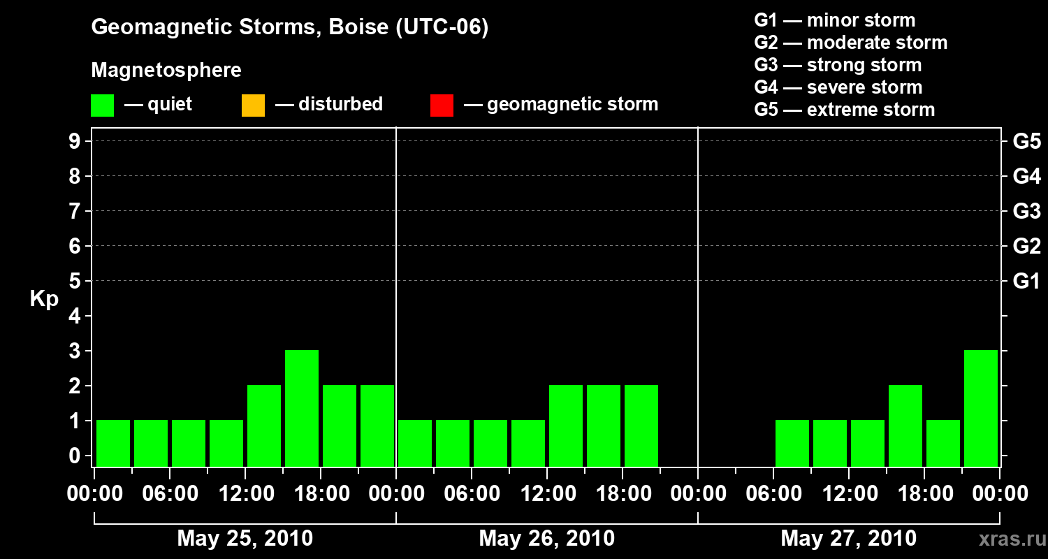 Changes in the geomagnetic index Kp from May 25 to 27, 2010 for mid latitudes