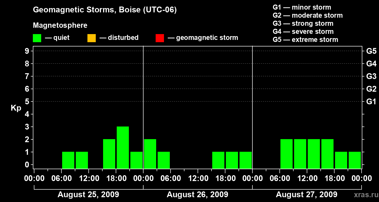 Changes in the geomagnetic index Kp from August 25 to 27, 2009 for mid latitudes