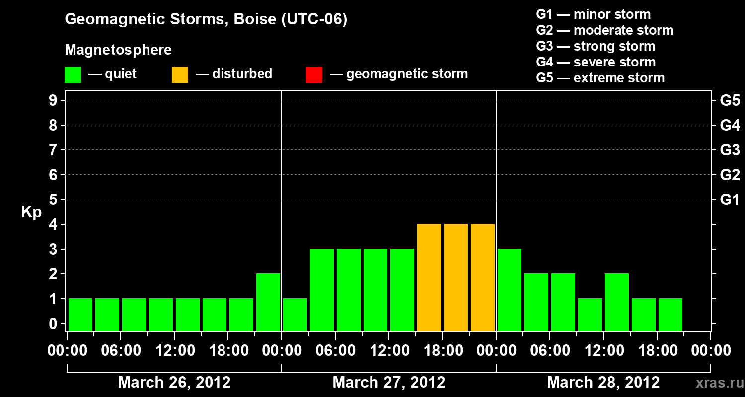Changes in the geomagnetic index Kp from March 26 to 28, 2012 for mid latitudes
