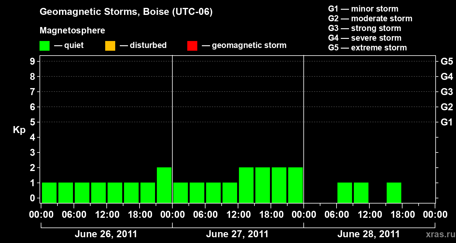 Changes in the geomagnetic index Kp from June 26 to 28, 2011 for mid latitudes