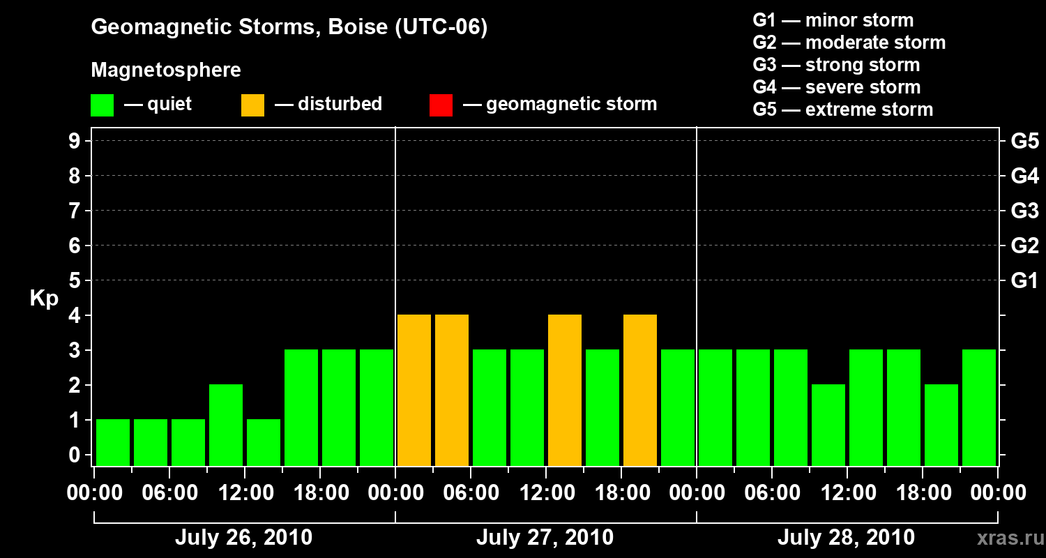 Changes in the geomagnetic index Kp from July 26 to 28, 2010 for mid latitudes