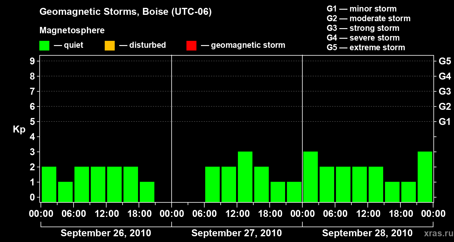 Changes in the geomagnetic index Kp from September 26 to 28, 2010 for mid latitudes