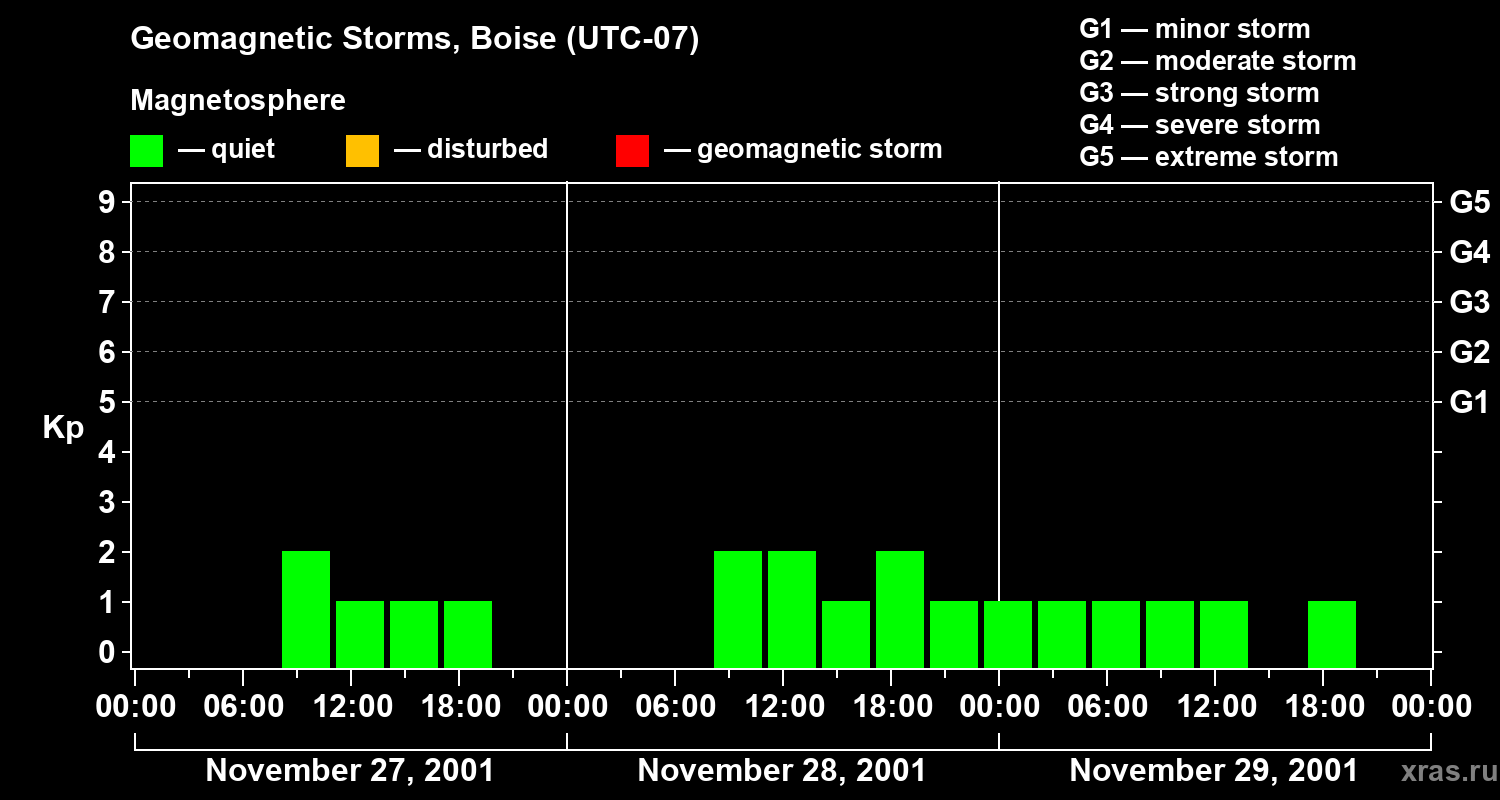 Changes in the geomagnetic index Kp from November 27 to 29, 2001 for mid latitudes