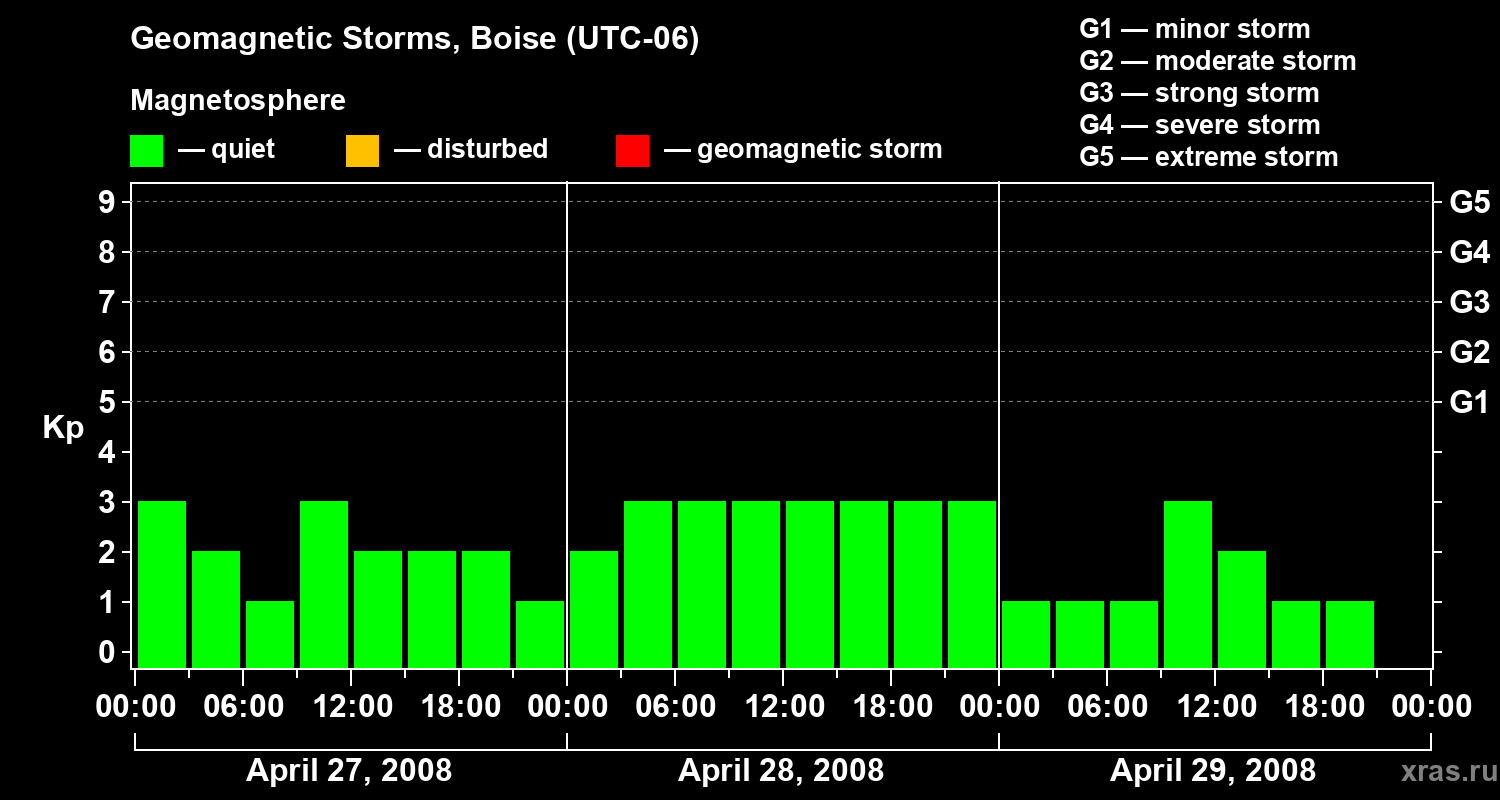Changes in the geomagnetic index Kp from April 27 to 29, 2008 for mid latitudes