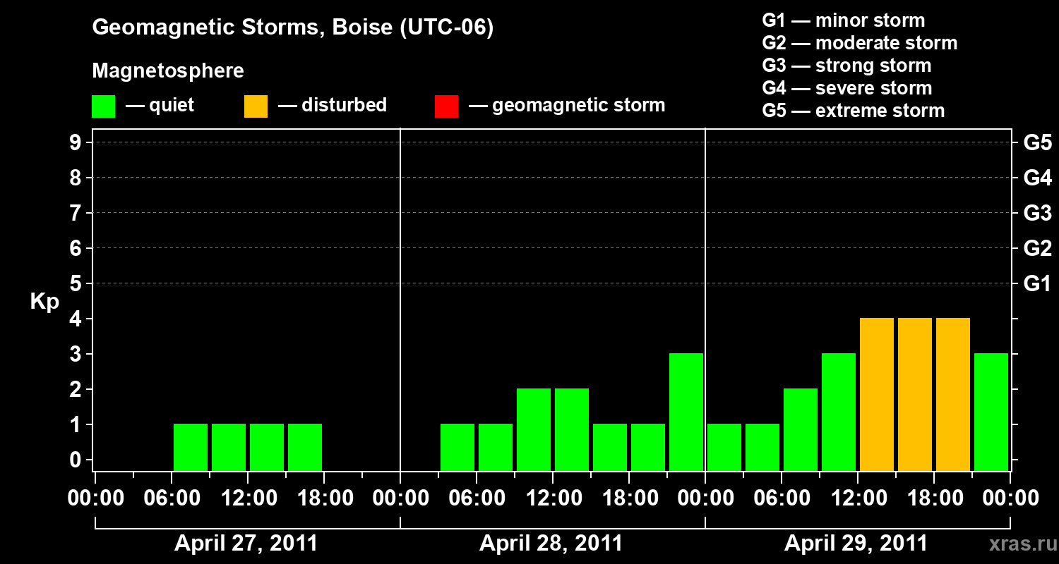 Changes in the geomagnetic index Kp from April 27 to 29, 2011 for mid latitudes