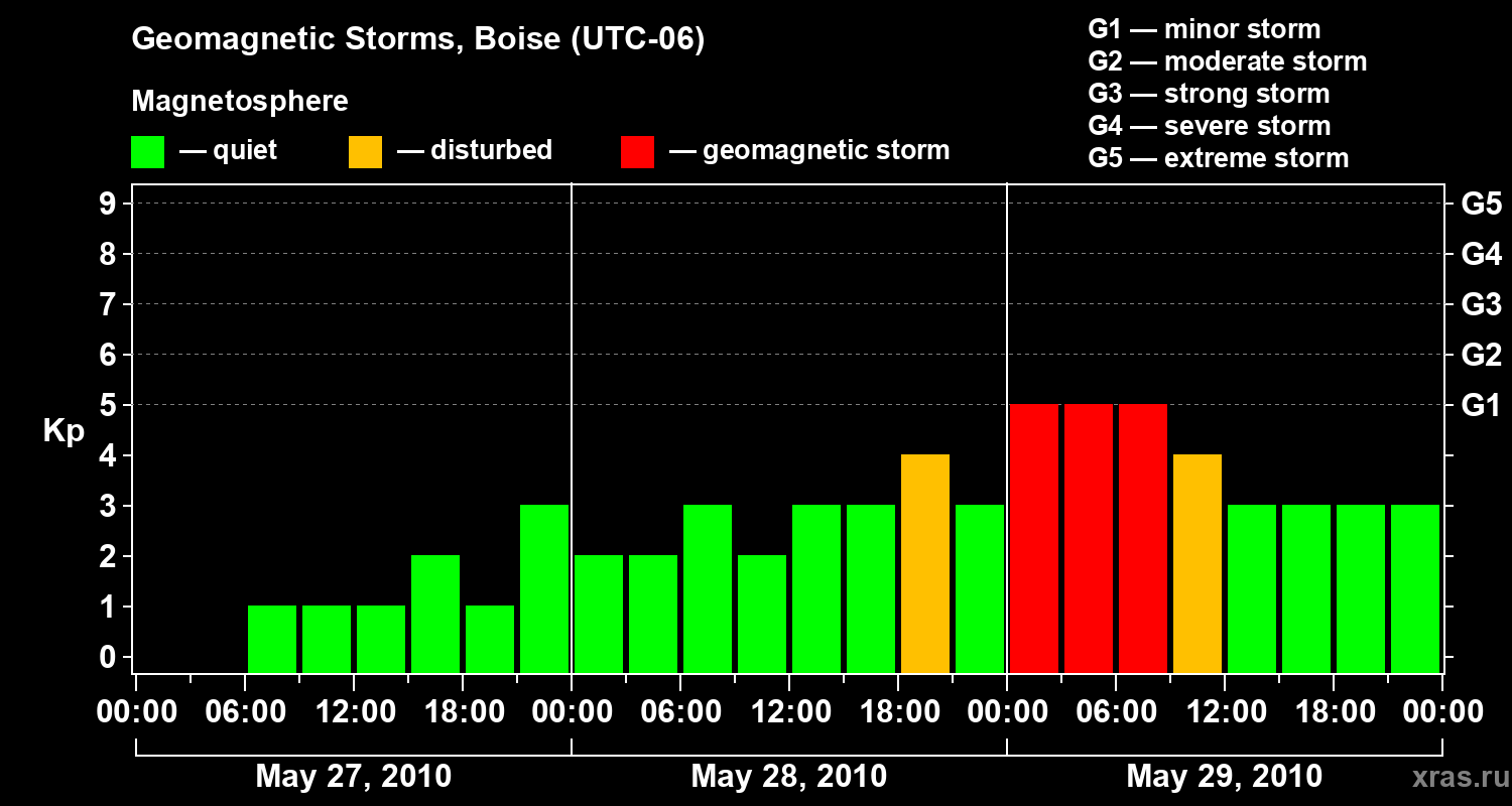 Changes in the geomagnetic index Kp from May 27 to 29, 2010 for mid latitudes