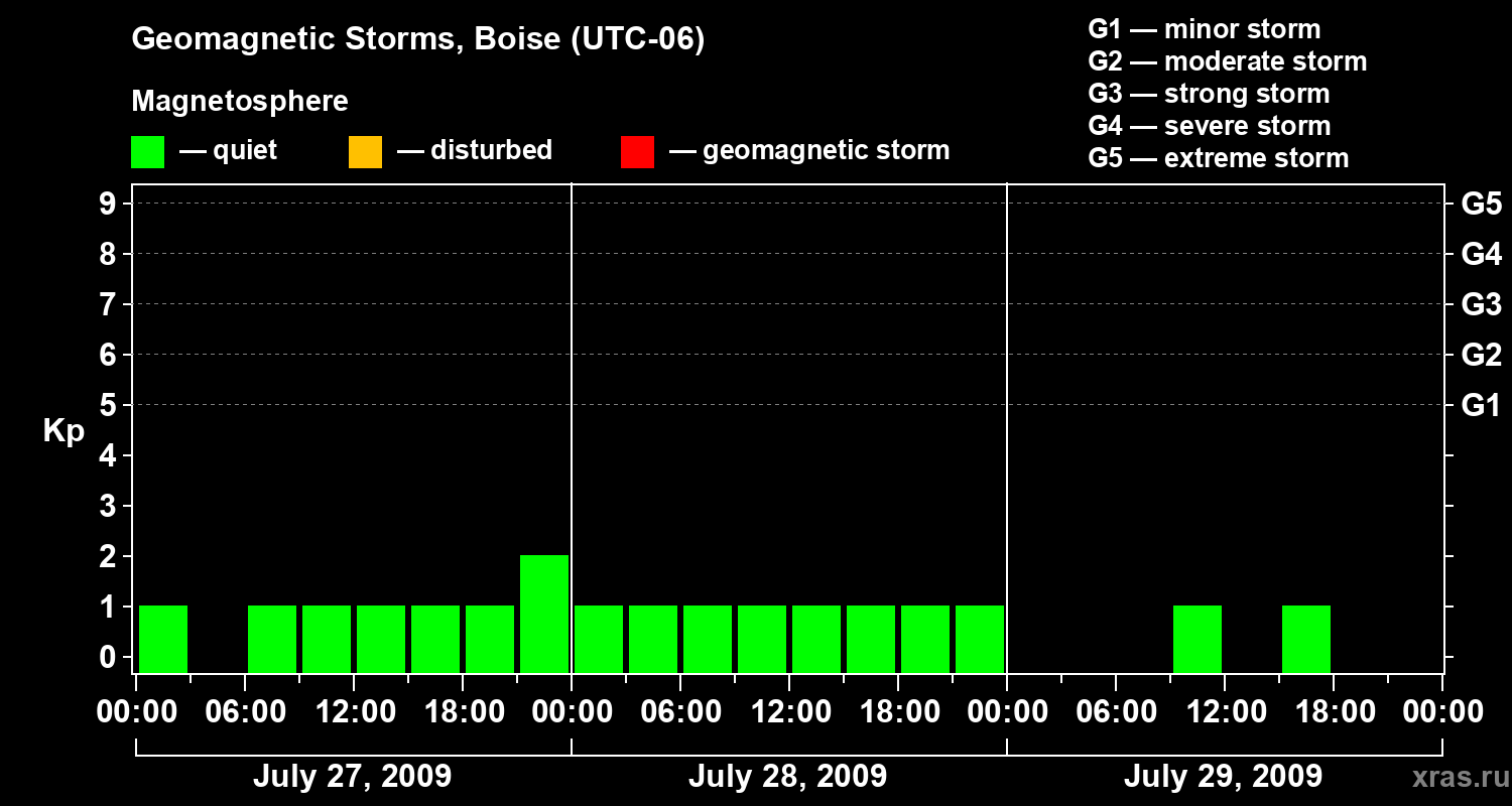 Changes in the geomagnetic index Kp from July 27 to 29, 2009 for mid latitudes