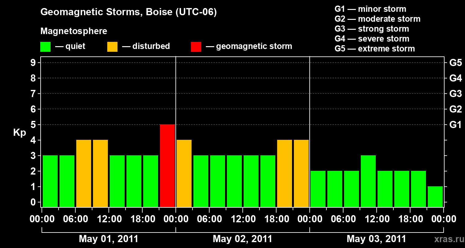 Changes in the geomagnetic index Kp from May 1 to 3, 2011 for mid latitudes