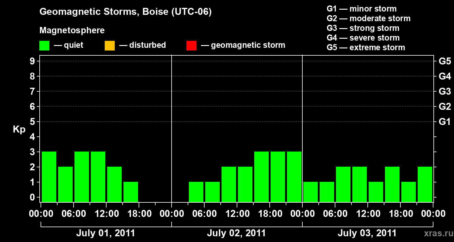 Changes in the geomagnetic index Kp from July 1 to 3, 2011 for mid latitudes