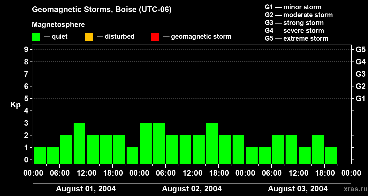 Changes in the geomagnetic index Kp from August 1 to 3, 2004 for mid latitudes