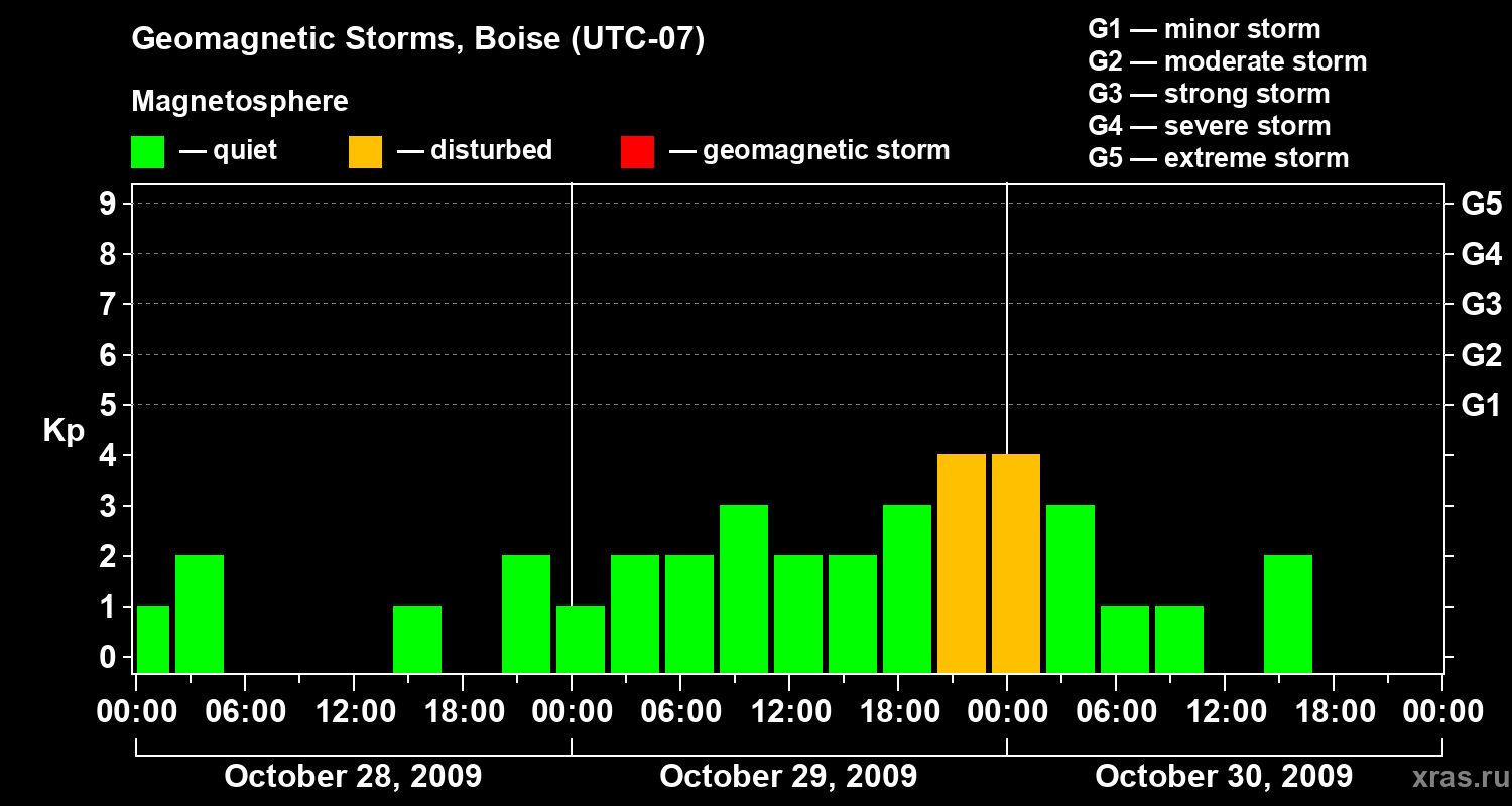 Changes in the geomagnetic index Kp from October 28 to 30, 2009 for mid latitudes