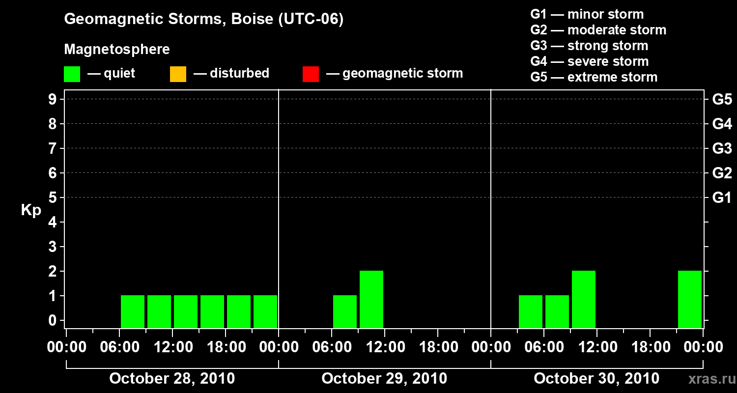 Changes in the geomagnetic index Kp from October 28 to 30, 2010 for mid latitudes