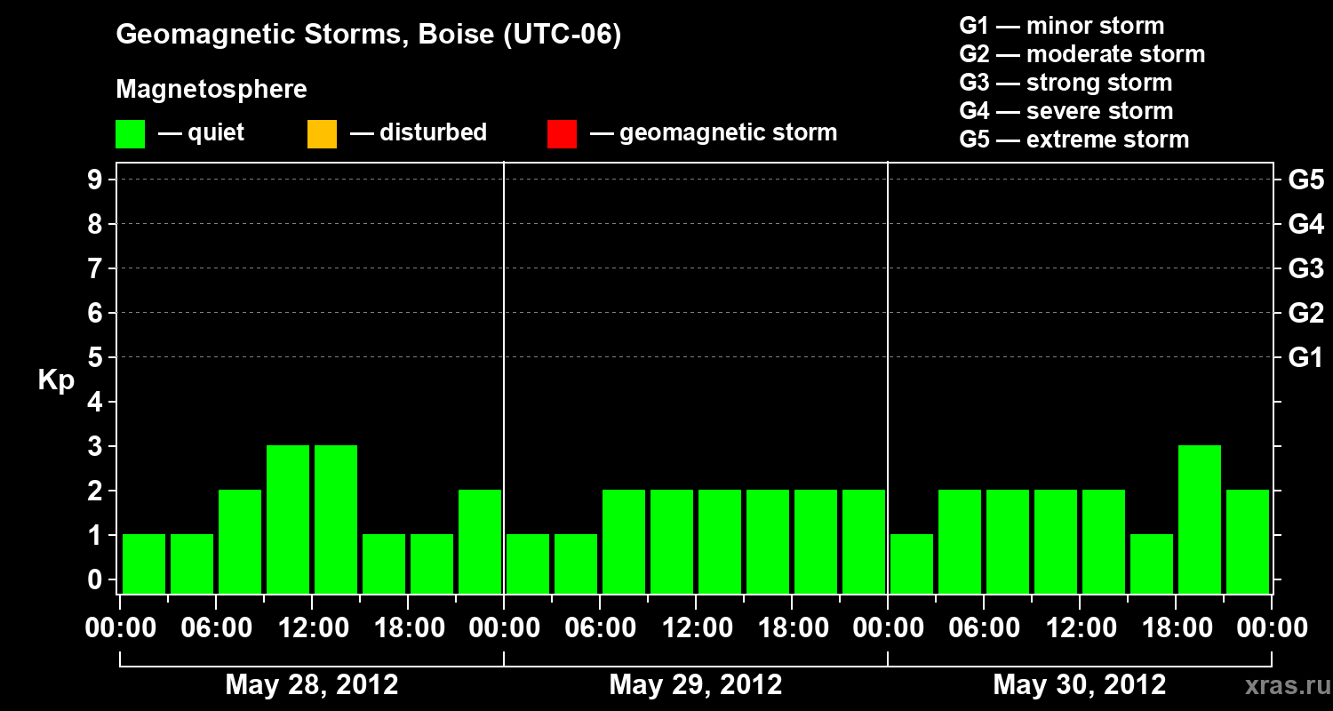 Changes in the geomagnetic index Kp from May 28 to 30, 2012 for mid latitudes