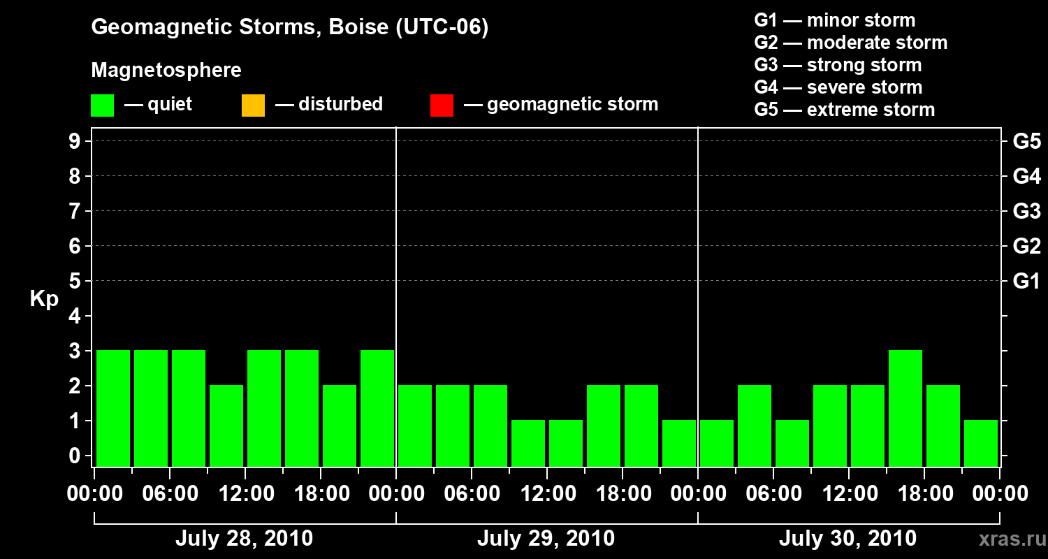 Changes in the geomagnetic index Kp from July 28 to 30, 2010 for mid latitudes