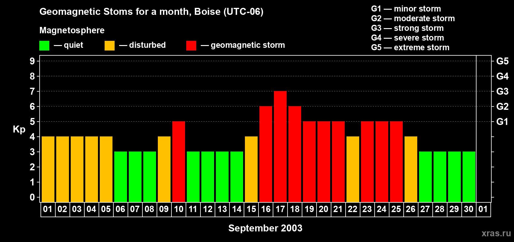 Changes in the maximum daily geomagnetic index Kp in September 2003 for mid latitudes
