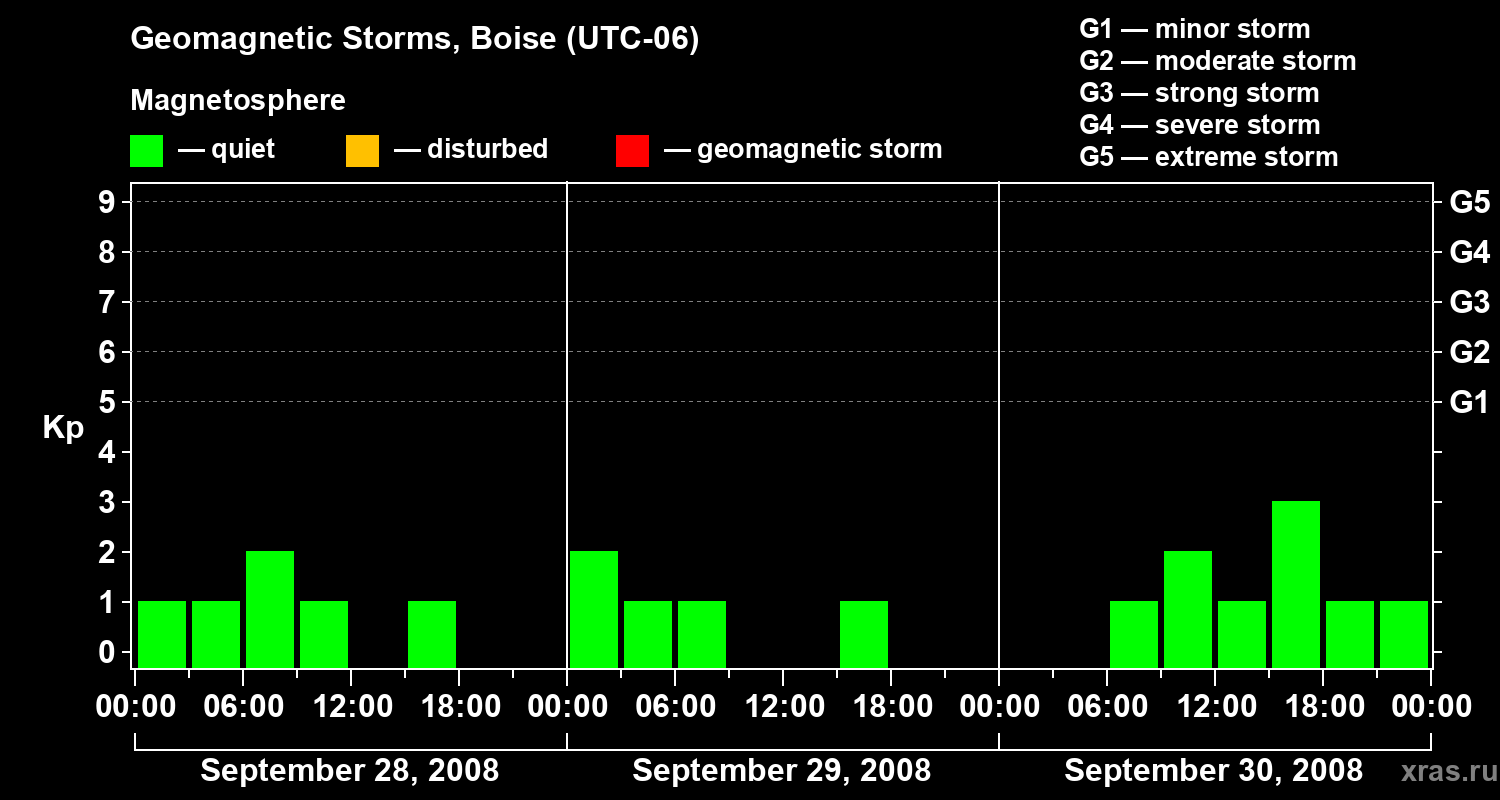 Changes in the geomagnetic index Kp from September 28 to 30, 2008 for mid latitudes